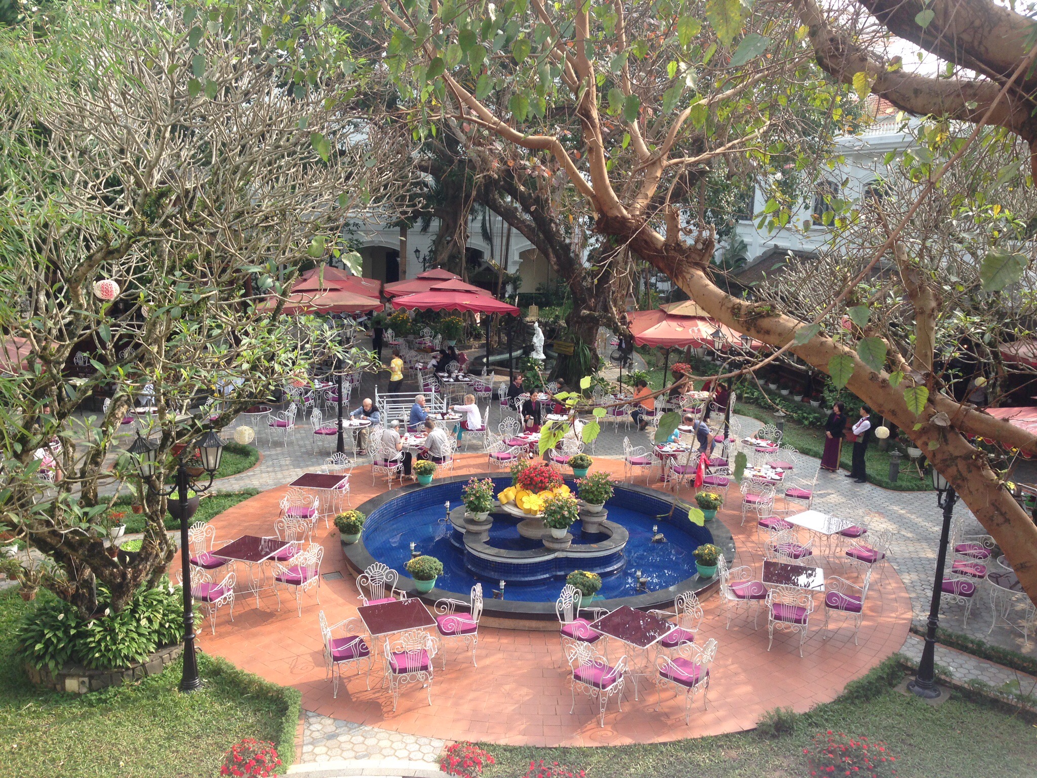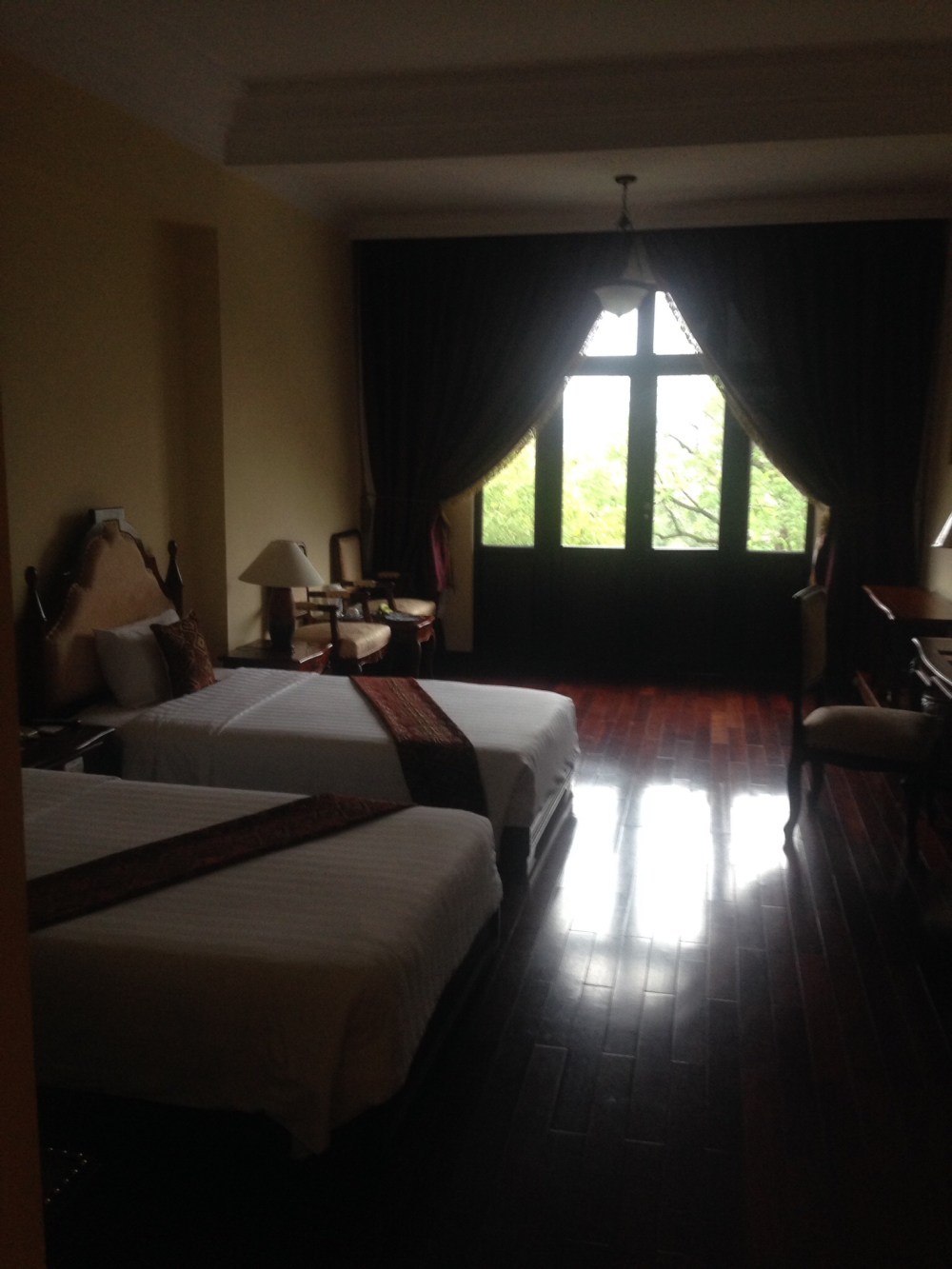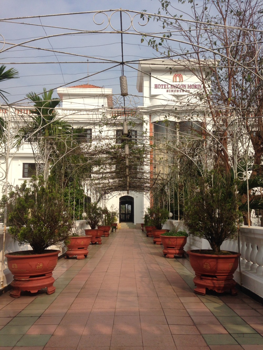 The city itself is not very different from Danang: another bustling busy city, where everyone is in a hurry to get somewhere on a scooter, bicycle, or vélo-moteur (now there’s a bit of vocab I haven’t needed for 23 years); but I stayed for just one night in the Hotel Siagon Morin, built in 1910 by the French on the banks of the Perfume river. It’s still all polished wood and mirrors, whitewashed pillars, with bits of beautiful fabric distributed at random around the walls and a level of service that even the snootiest maitre d’ couldn’t fault. Apart from all the smiling staff.